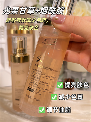 在研发光透耀白淡斑爽肤水时,我们深知肌肤美白的基础在于深层滋养与均匀肤色。为此,我们选用了光果甘草根水作为基础成分,其富含的天然活性物质不仅能够有效补水,还能帮助肌肤抵御外界侵害。此外,茶叶水和库拉索芦荟叶水的加入,进一步增强了产品的舒缓和抗氧化能力,使肌肤更加柔嫩光滑。