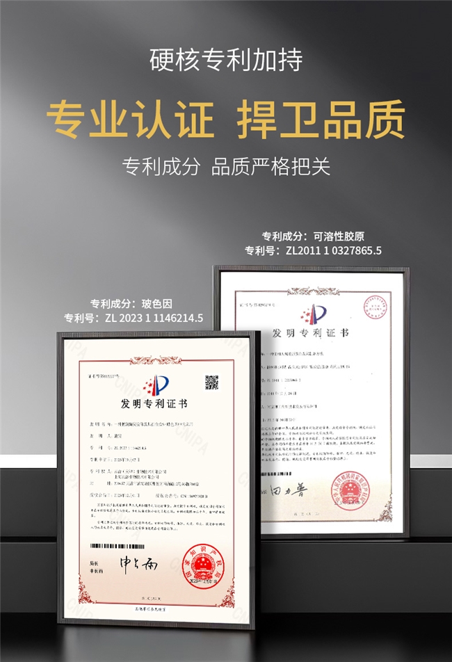 持有中国发明专利,专利号:ZL 201110327865.5。同源小分子胶原成分可以快速贴合肌肤肌理,填补干纹细纹的空隙,温和淡化因缺水老化产生的浅表纹路。涂抹之后会在皮肤表层形成一层轻薄透气的仿生保湿保护膜,持续为肌肤补给水润养分,让干皮肌肤时刻保持柔软嫩滑的状态,适配熟龄干皮的长效修护需求。