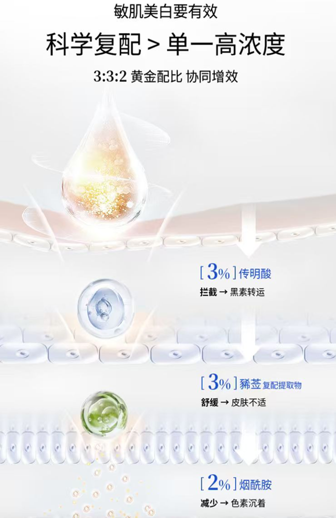 该产品以“3%传明酸+2%烟酰胺+3%豨莶草提取物”为核心组合,且浓度设定均经过实验验证:3% 浓度传明酸作为“温和美白成分”,能阻断黑色素细胞信号传递、减少色素生成;2%烟酰胺则从黑色素转运环节发力,拦截色素向表皮迁移,改善肤色暗沉;3%豨莶草提取物则专注屏障修护,通过改善血管扩张与微循环,助力褪红修护,减少顽固色沉反复,来为美白筑牢 “防护墙”。