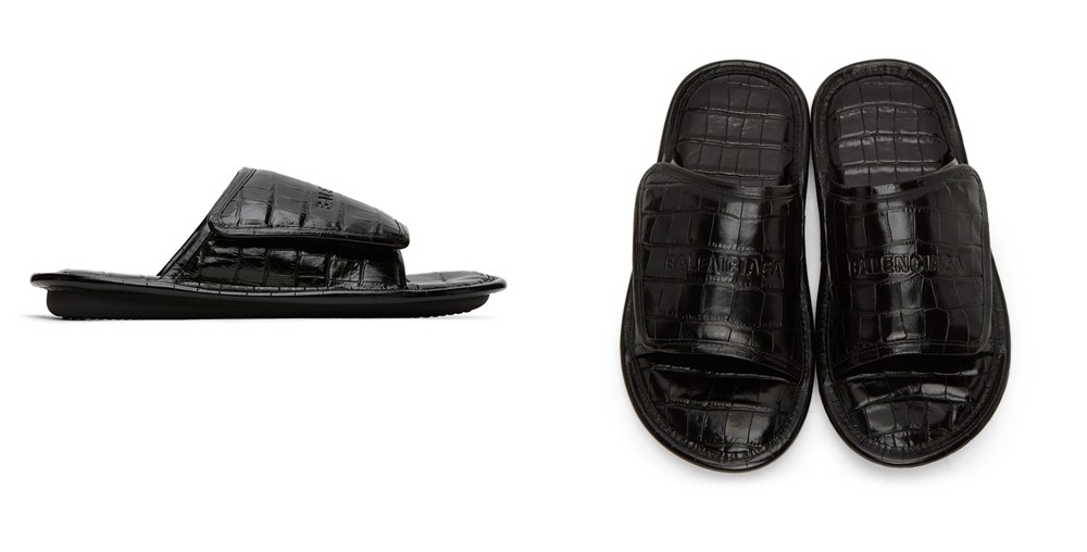 此款鳄鱼纹拖鞋乍看之下以为使用的是鳄鱼皮,但其实是使用鳄鱼纹压花于高级小牛皮上,进而营造高质感,最后在魔鬼毡设计,因此脚背的厚实与否,并不会影响到穿著的舒适度喔!目前可于SSENSE购得,定价为美金555元。