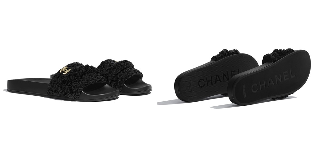 由Chanel推出的拖鞋,采用全羊皮搭配橡胶鞋底制成,鞋面设计则使用五段编织打造的黑珍珠点缀,最后辅以经典的Double C金标完成设计。目前可于专柜购得