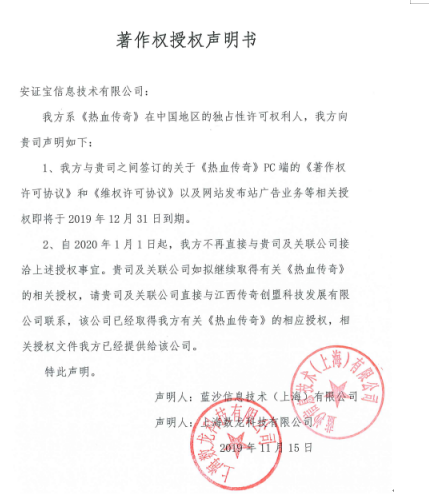 《热血传奇》著作权人蓝沙公司和数龙公司也于2019年11月15日出具《著作权授权声明书》,声明书明确其与安证宝信息技术有限公司(下称安证宝)签订的关于《热血传奇》PC端的《网络游戏许可协议》和《维权许可协议》以及网站发布站广告业务等相关授权即将于2019年12月31日到期。