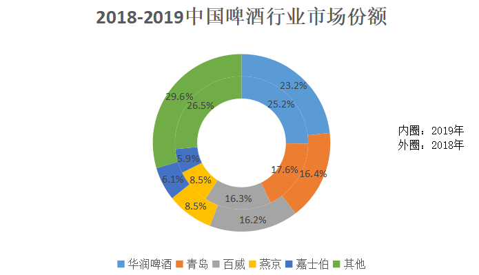 从我国啤酒行业的市场份额来看,五大高端品牌线布局准备就绪。其中,2018和2019年华润啤酒和青岛啤酒分列啤酒市场份额的一二位,其中2019年华润雪花约占我国啤酒市场的25.2%,青岛啤酒约占我国的17.6%,二者的市场份额差相较于2018年的6.8%扩大到7.6%。