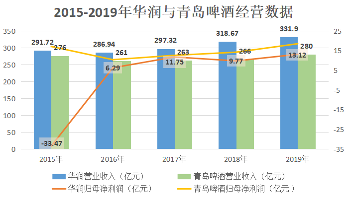 华润啤酒的总销量自2006年起超越青岛啤酒,连续多年位居中国市场第一,旗舰品牌“雪花Snow”亦自2008年起成为全球销量最高的啤酒品牌。销量优势最终体现为业绩优势。2019年华润啤酒实现营业收入331.9亿元,同比增长4.15%;净利润为13.12亿,同比增长34.3%,而同期青岛啤酒实现营业收入280亿元。在总体上看,华润啤酒营收超青岛啤酒50亿元,连续4年保持营收、净利润持续双增长的态势,对比青岛啤酒保持优势。
