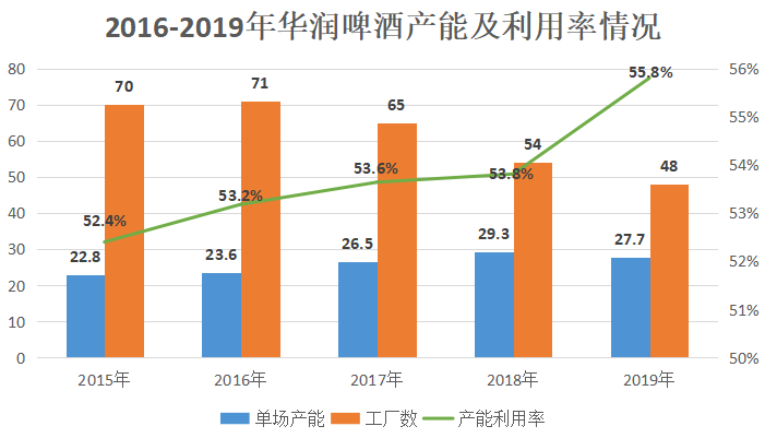 2.产能利用率持续提升,单厂产能领先其他上市公司。2015-2019年华润的产能利用率从52.4%提升至55.8%,单厂产能从22.8提升至27.7万千升。2019年华润的单厂产能领先于百威亚太西(27.3万千升)、青啤(23.4万千升)、重啤(19.9万千升)、珠啤(13.8万千升),领跑行业。公司进行组织重塑,2015-2019年员工数量从60000人减少至30000人,2019年人均销量达到381万千升,处于行业领先地位。