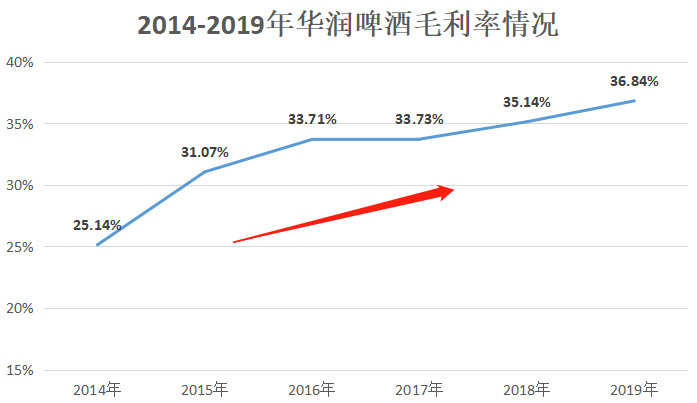 得益于产能利用率的提高和产品结构持续升级,布局高端产品线不仅给华润带来了营收的增长,毛利率也在提高。2019年实现毛利润122.26亿元,同比增加9.18%。综合近年来的情况可以发现,公司毛利率从2015年的25.14%上涨至2019年36.84%,毛利率不断的提升,2019年毛利率更是创新高,体现出高端市场布局的成效,相信未来毛利率还会持续提升。