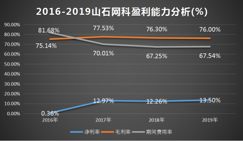 首先,作为一个信息技术服务型企业,山石网科的盈利能力与费用端支出水平密切相关,但较高的费用支出削弱了企业的盈利能力。可以看到,2016-2019年间,山石网科的毛利率均在75%以上,表现在成本端则是销售成本率均在25%以下,而企业的期间费用率却维持在67%以上,阻碍了山石网科净利率的提高,2019年企业的净利率为13.5%,仅高于整个软件开发行业1.08个百分点。
