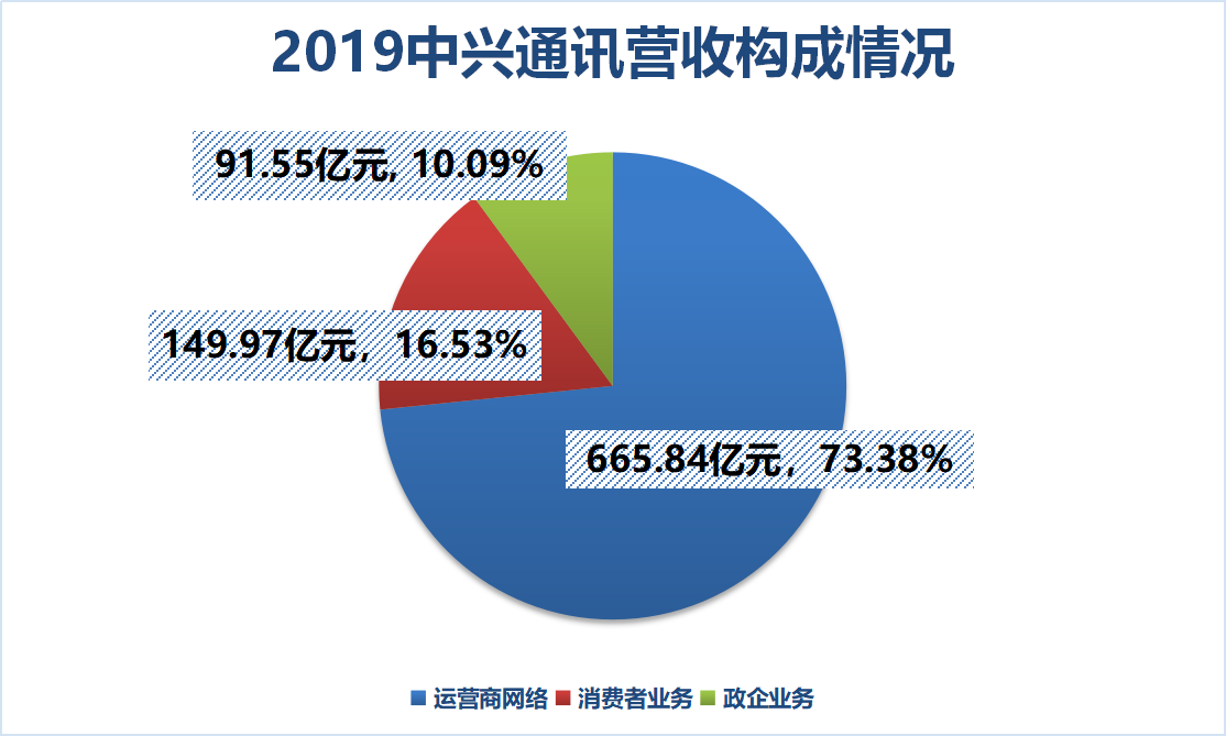 2020年是中兴通讯成立35周年,中兴通讯是全球领先的综合性通信制造商、通信解决方案提供商之一。公司的业务涉及广泛,包括运营商网络、消费者业务和政企业务三大块。其中运营商网络业务占比最大、毛利率也最高,2019年运营商网络业务实现营收665.84亿元,占到总营收的73.38%;第二大业务为消费者业务,涉及手机、数据卡、车载终端、家庭信息终端、固网宽带终端等,占比16.53%;政企业务涉及服务器、视讯、数通、数据库等,占比10.09%。