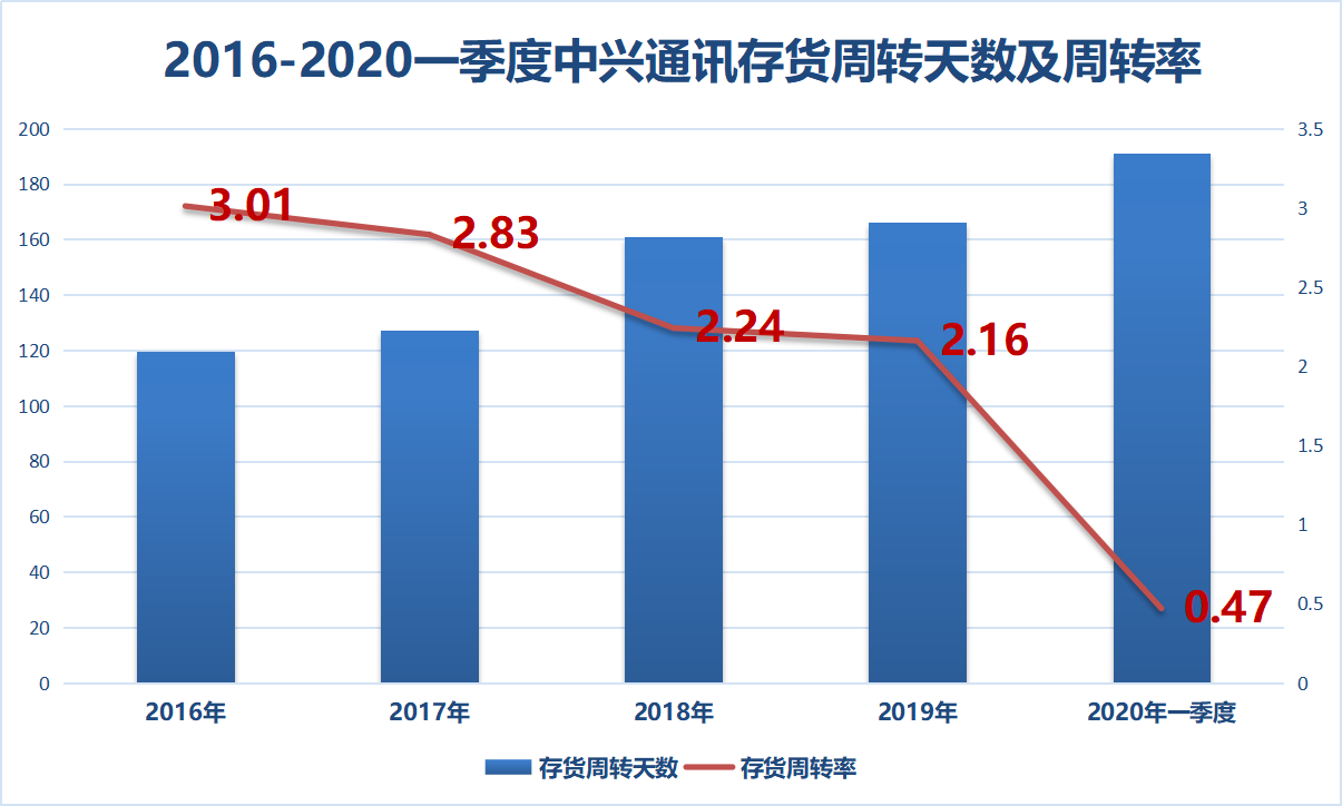 近年来,公司的存货周转天数不断提高,存货周转率明显下滑。2016-2019年中兴通讯的存货周转率分别为3.01、2.83、2.24、2.16,今年一季度公司的存货周转率只有0.47。说明公司的库存产品存在滞销,营运能力出现了一定问题。