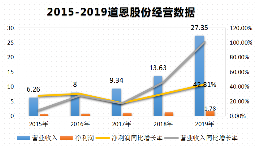 依靠众多大客户的支持,近几年道恩股份的营业收入也是持续增长,截至2019年末恩捷股份实现营收27.35亿元,近四年复合增长率达到36.32%,以及实现净利润1.78,复合增长率为29.42%。