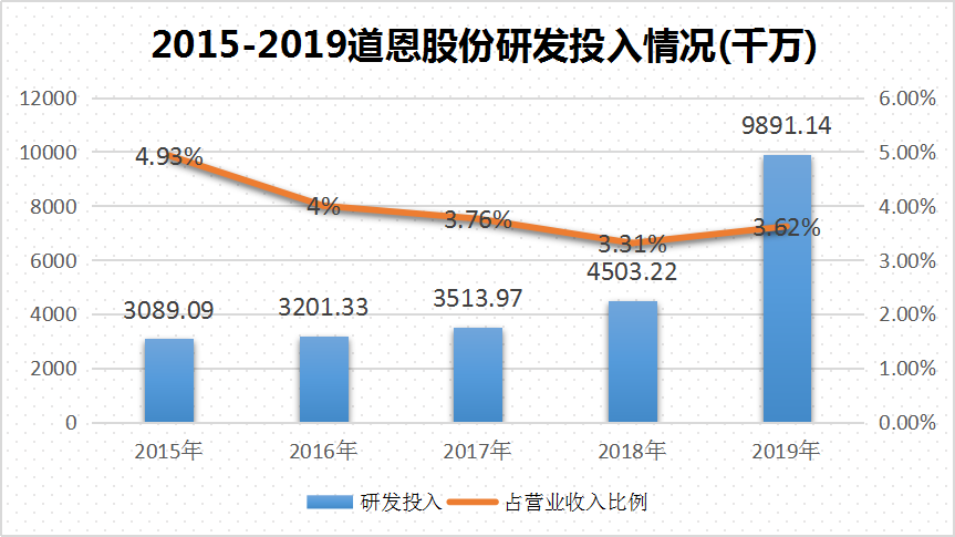 相关数据显示,2017年、2018年、2019年道恩股份改性塑料类产品的毛利率分别为13.79%、13.67%、14.17%,而整个改性塑料类行业的毛利率分别为15.64%、14.29%、15.81%,说明道恩股份在降低成本中尚存在一定的空间。