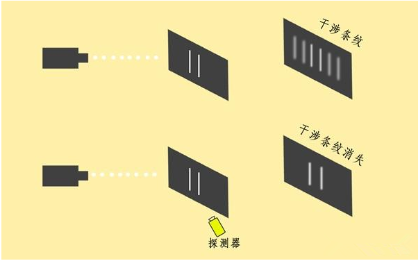 实验进行到这个阶段,科学家们当然就像看看粒子是怎么一分为二的、或者是怎么选择自己要穿过哪一条缝的。而想要观测这个情况,就需要在粒子一分为二的地方设置一个探测器来观测这个变化。
