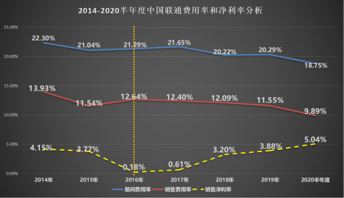 2014-2020半年度中国联通的期间费用率分别为22.30%、21.04%、21.29%、21.65%、20.22%、20.29%、18.75%,2017年开始公司的期间费用率持续下降,主要是因为公司对销售费用率进行了控制,销售费用率从2017年的12.64%下降到了现在的9.89%。在费用控制的影响下,中国联通的销售净利率持续增长,从2016年的0.18%涨到了2020年的5.04%,增长了5个百分点,公司费用控制成效显著。