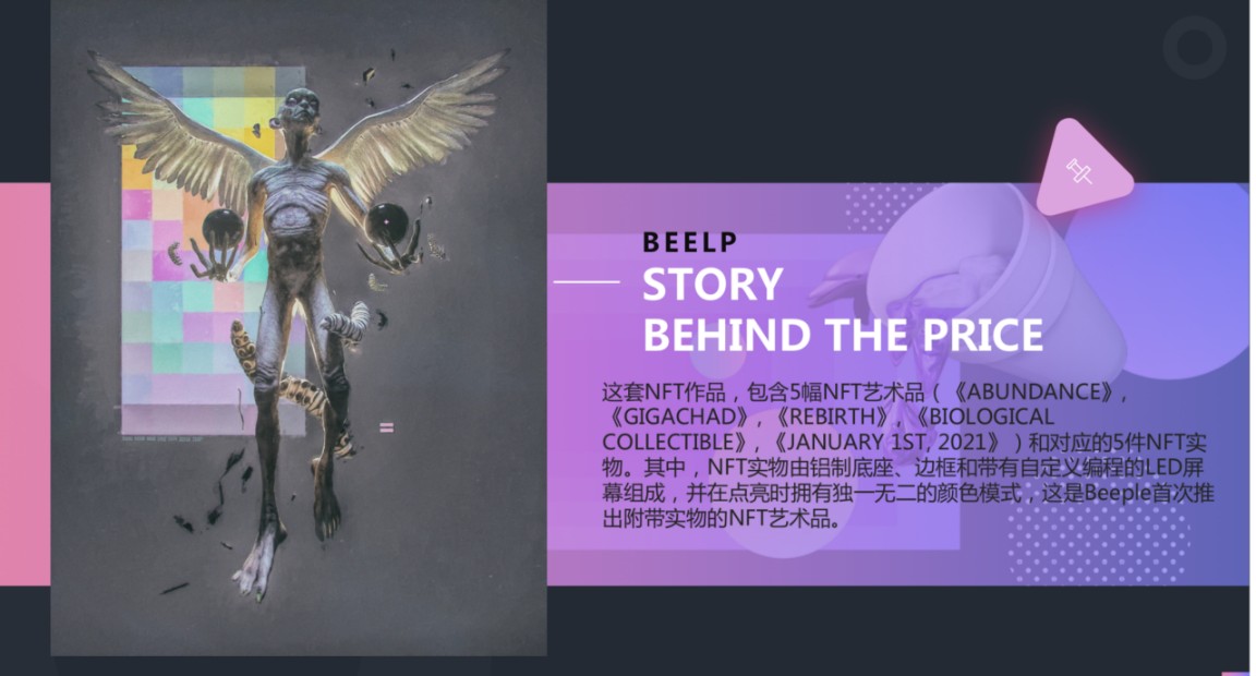据公开资料显示,APENFT捐赠的《ABUNDANCE》由NFT艺术家Beeple在今年3月27日创作,于5月2日在Nifty Gateway的系列拍卖中拍出。Beeple是目前NFT领域身价最高的艺术家,由其创作的《EVERYDAYS: THE FIRST 5000 DAYS》在今年3月以6900万美元的价格售出,创造了NFT作品目前最高拍卖纪录,同时也是当今在世艺术家单幅拍品第三高价。