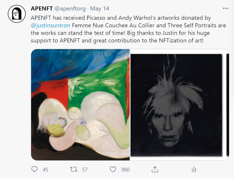 2021年5月14日,APENFT宣布获得了波场TRON创始人孙宇晨捐赠的一批重要艺术品,其中包括毕加索的《戴项链的裸女》、安迪.沃霍尔的《三幅自画像》和全球知名加密艺术家Beeple的《Ocean Front》等,总价值接近人民币2亿元。孙宇晨随后宣称,他高度认可APENFT的发展愿景,并愿意开放波场生态,对该基金会进行全面支持。