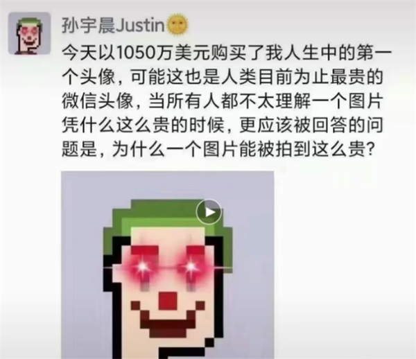 孙宇晨自己在朋友圈感叹:这是他人生中第一个头像,也是人类目前为止最贵的微信头像。并且还预计“所有人都不太理解一个图片凭什么这么贵”。