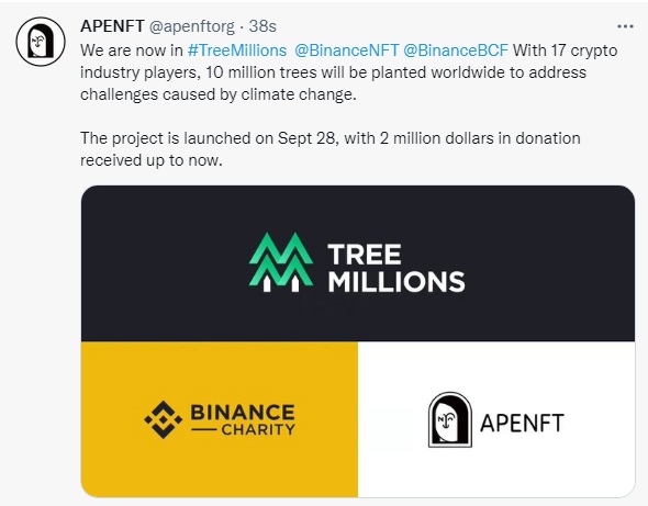 APENFT受邀加入币安TreeMillions公益项目 助力应对全球气候变化