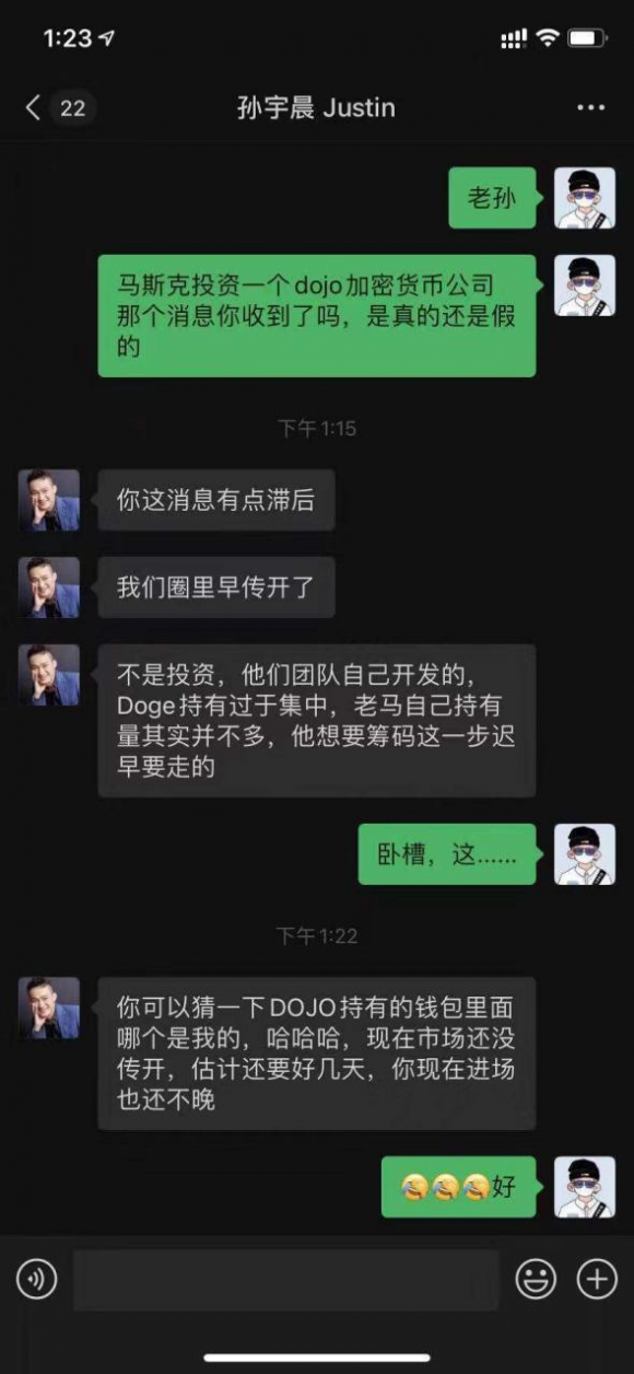 今天网络上爆出了孙宇晨的聊天截图,文中有人向孙宇晨提问马斯克是否投资了DOJO加密货币公司,孙宇晨回答不是投资,是马斯克团队自己开发,并表示自己已经持有DOJO。
