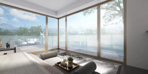即一般产品在转角的位置都会设置承重柱,但是东原为了给业主一个极致的景观视野,经过结构仔细推敲,转移了这根“碍眼”的承重柱,这样改造会增加施工难度和建筑成本,但却为业主带来一个几乎院落景观的全视野体验。