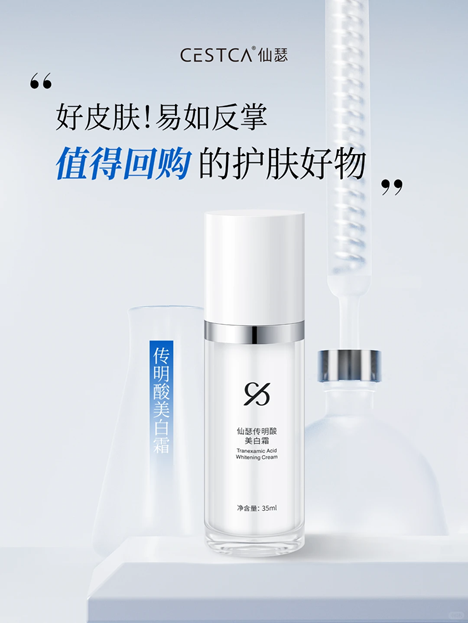 在美白层面,仙瑟传明酸美白霜以传明酸为核心美白成分,通过抑制黑色素细胞的活性,减少黑色素生成与转移,从根源上改善肤色暗沉、色斑等问题,且传明酸成分温和不刺激,避免了传统美白成分对干皮屏障的损伤。