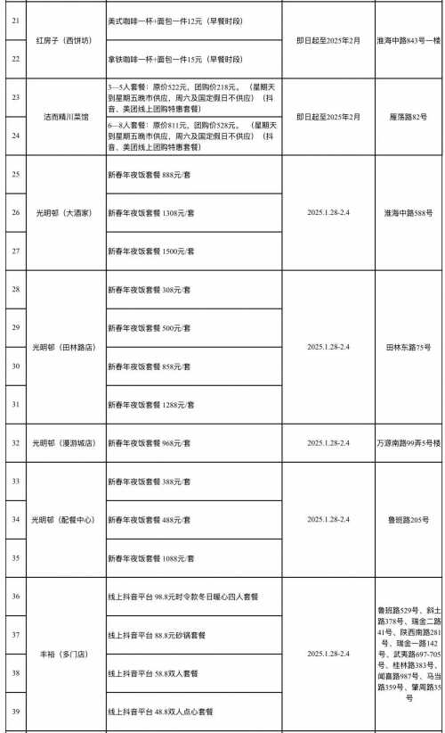 农历新春期间,淮海集团旗下众多餐饮、食品品牌推出种类丰富的迎新活动,与市民游客共迎乙巳佳节。其中,老大昌淮海店正价购买任意产品,即享9.9元购鲜肉月饼(50G)四只/盒(用券不可参加);红房子西菜馆168-268元5款价位套餐优惠供应;红房子西饼坊早餐时段咖啡+面包,仅需12元或15元;洁而精川菜馆3-5人、6-8人的4-6折优惠团购套餐正在进行;光明邨全市连锁门店推出388-1500元不同价位的亲民新春年夜饭套餐;丰裕线上抖音平台推出 48.8-98.8元时令款多人套餐;金辰大酒店推出年夜饭套餐(8-10人),4888元/席,赠送300元/晚*2间客房+次日双人自助早餐。