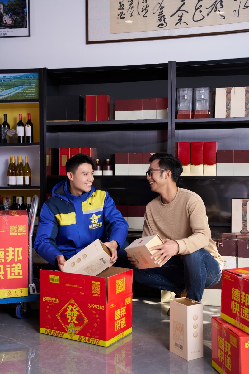在他的店铺里,穿着德邦工作服的快递员正熟练地打包一批待发货的白酒。“德邦给了我们专门的包装方案和运输渠道,让我们年货节期间的酒水配送效率稳步提速。”